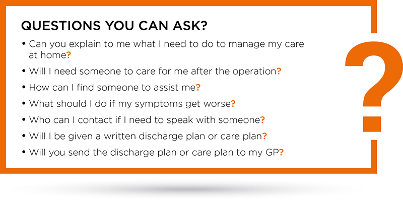Ask for a written discharge plan or care plan that summarises why you came into hospital, the care you received, the plan of action when you leave the hospital and lists any follow-up appointments.