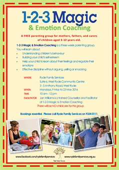The successful 1-2-3 Magic and Emotion coaching program for parents of children 3 – 12 years is on again this May through Ryde Family Services.