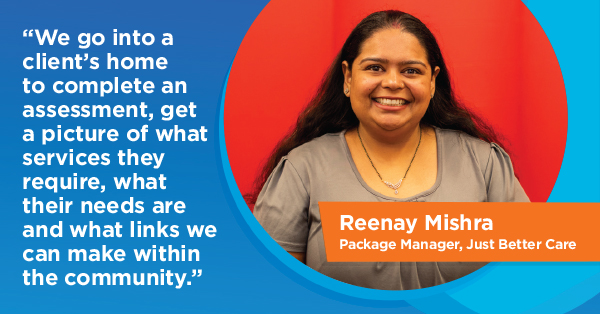 Reenay Mishra, Package Manager at Just Better Care, says, “We go into the client’s home to complete an assessment and see what links we can make within the community. … If they are comfortable, they are more likely to work harder towards rehabilitation and wellness, and that means avoiding going back into the hospital.”