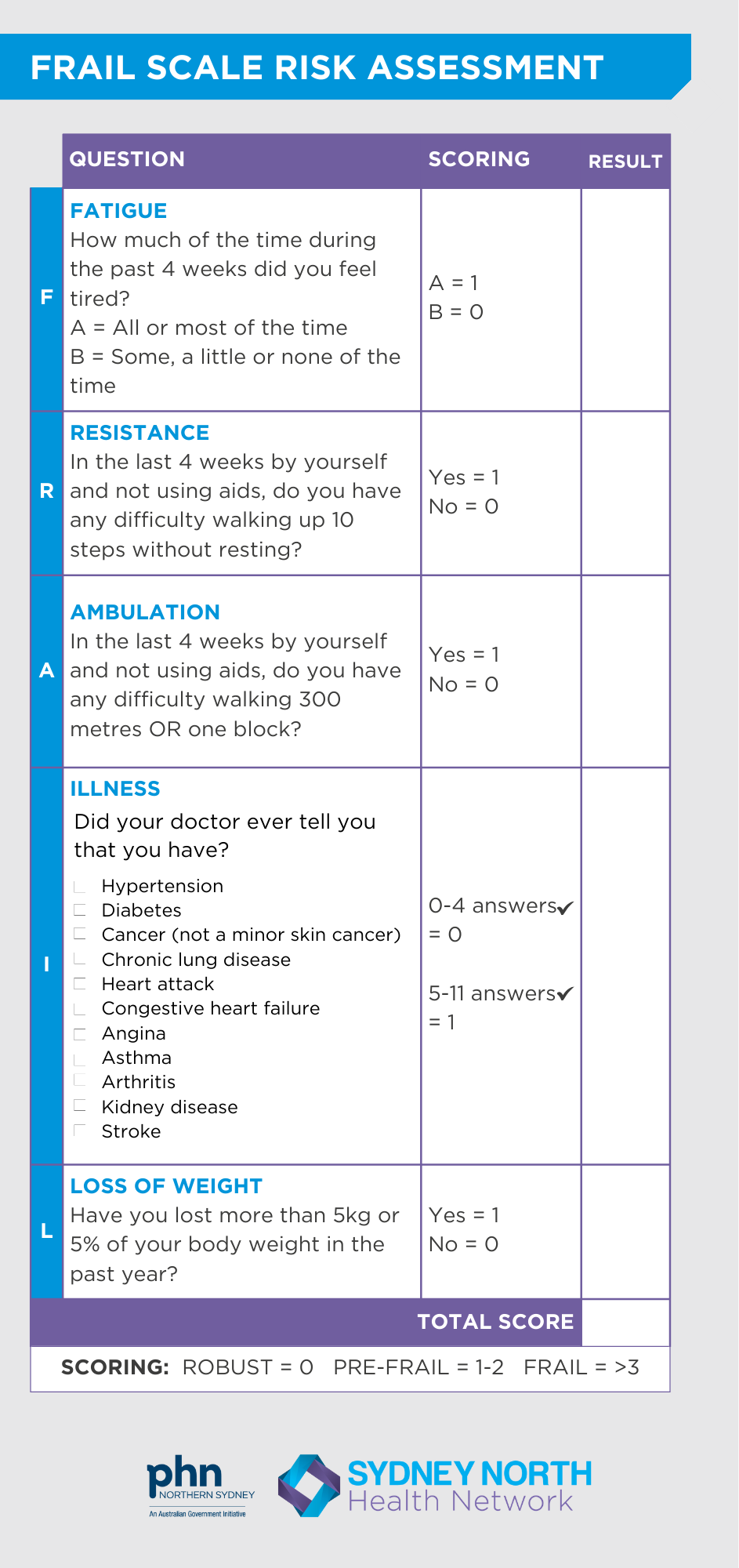 In Northern Sydney we recommend the use of the The Frail Scale to identify a level of frailty.