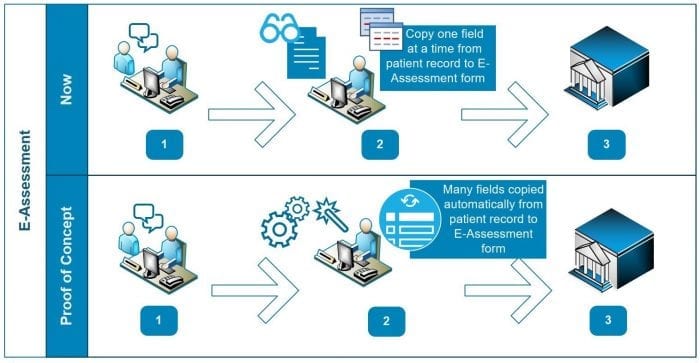 HealthDirect Australia, the Departments of Health, the Department of Social Services and Strata Health are currently developing a Proof of Concept (PoC) to support primary care clinicians in completing the e-assessment application form (by integrating the primary care clinical management systems with the government My Aged Care systems).